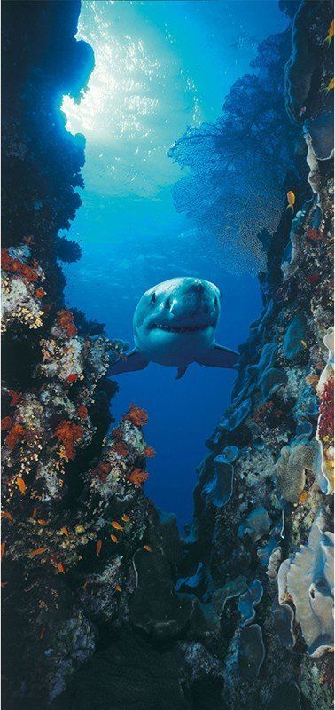 С фотообоев Komar Shark 2-1002 за нами подглядывает большая белая акула - гроза морей