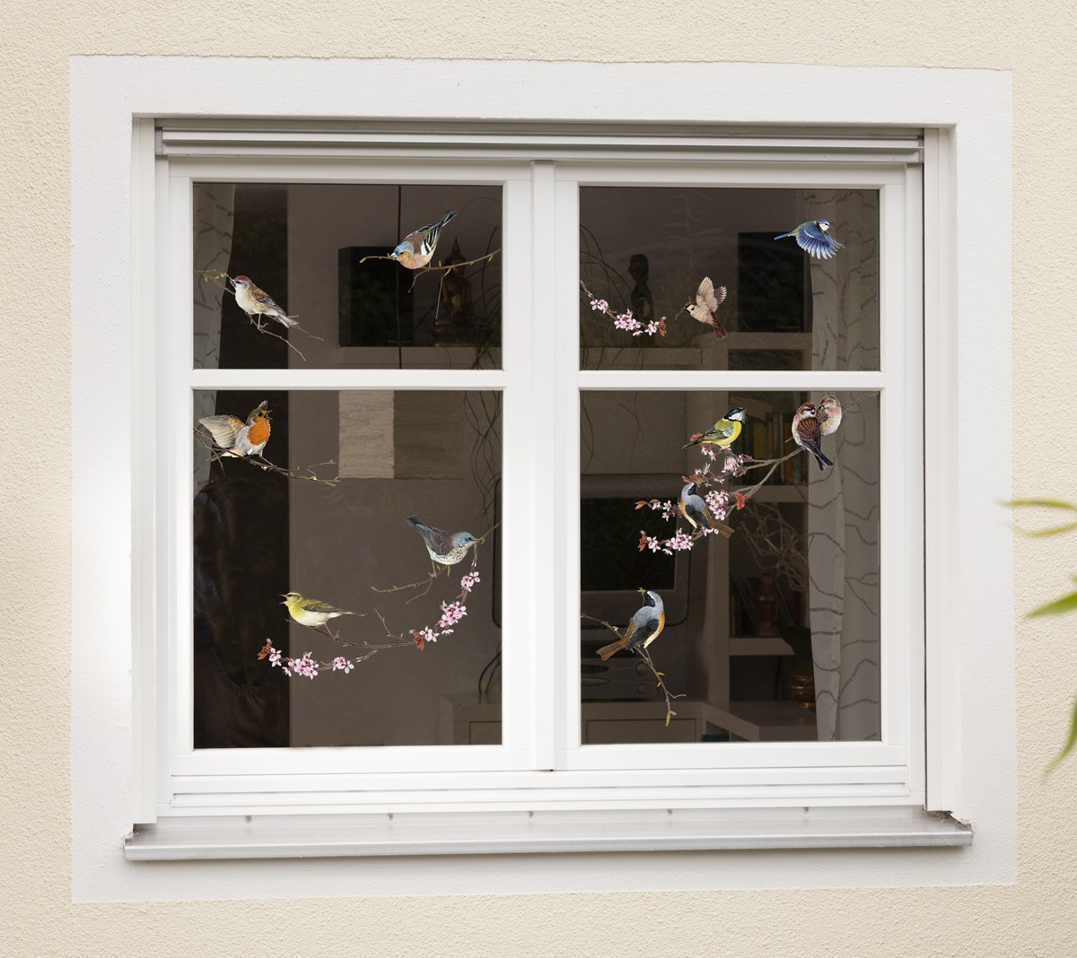 Радостная птичья стая, сидящая за окном.