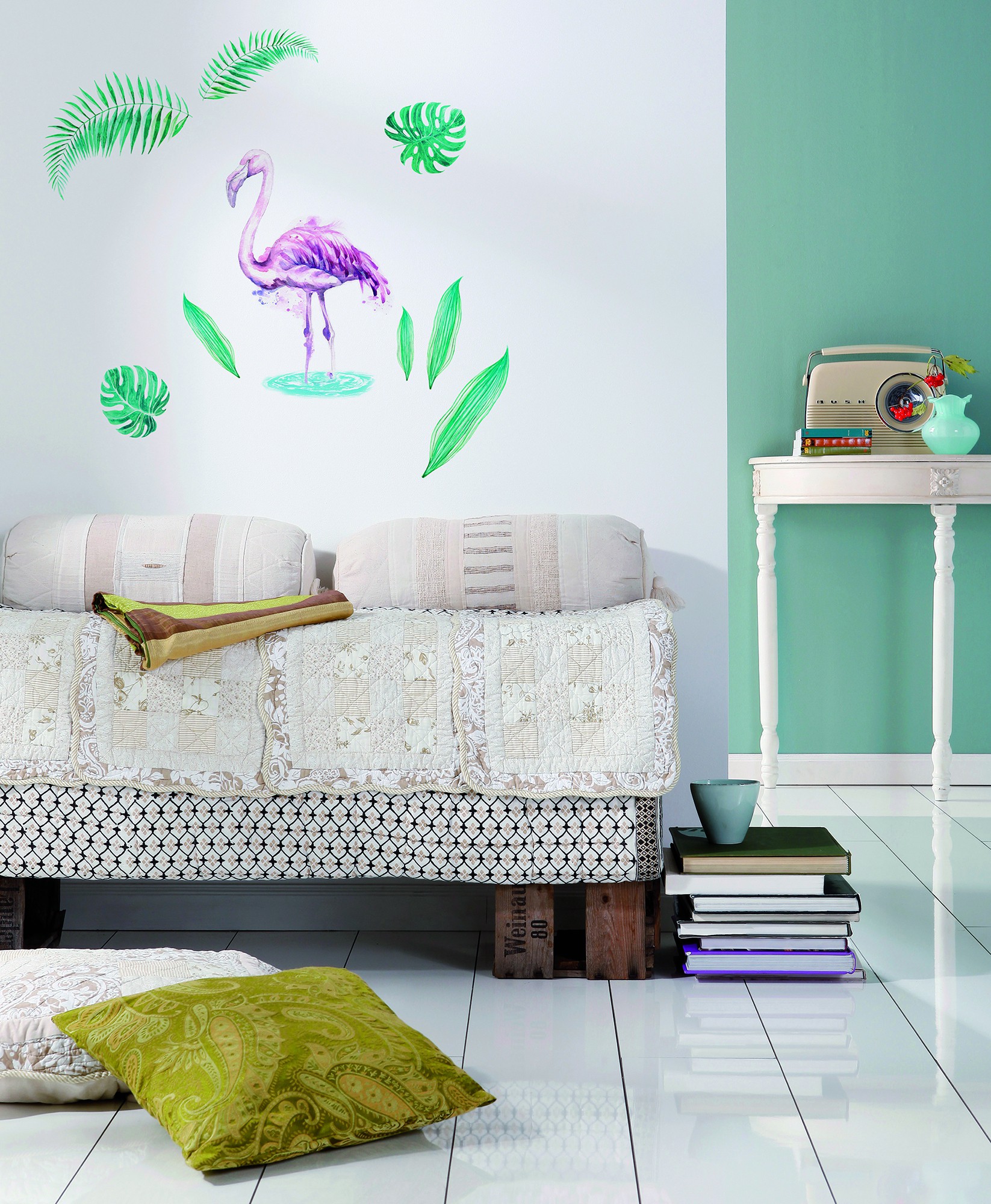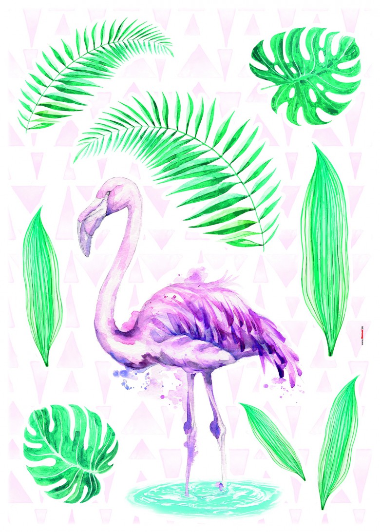 Флора и фауна для жилого пространства: наклейка для стен с изящным фламинго и зелеными листьями создаст на стене природный мотив.