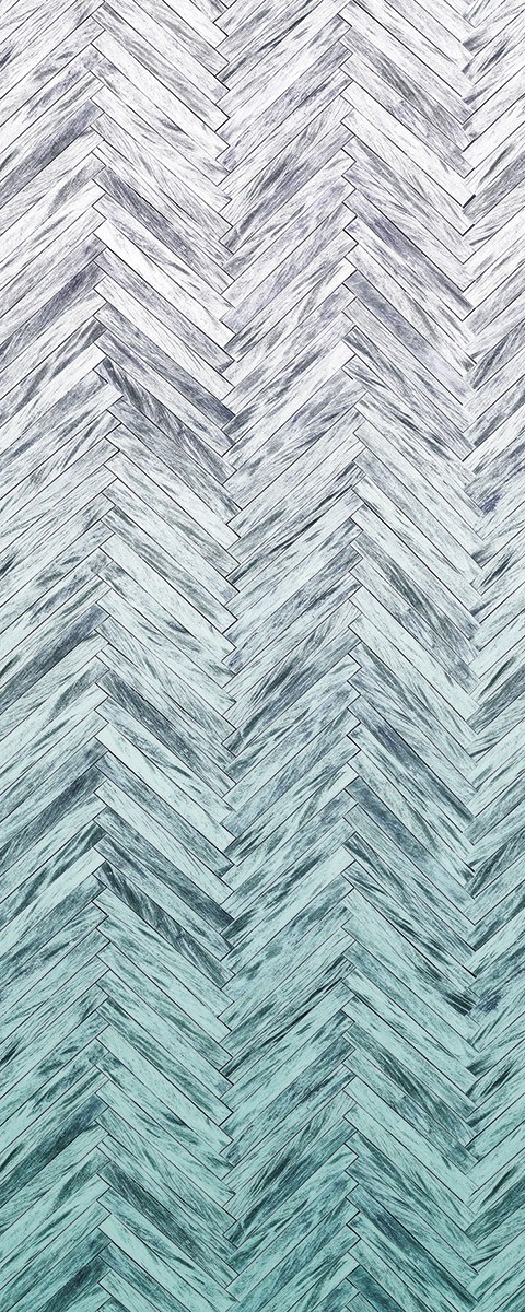 Традиционное дерево под новым углом зрения: паркетный рисунок «ёлочка» розового, бирюзово-серого или желтого оттенков с современным переходом цвета от темного к светлому.