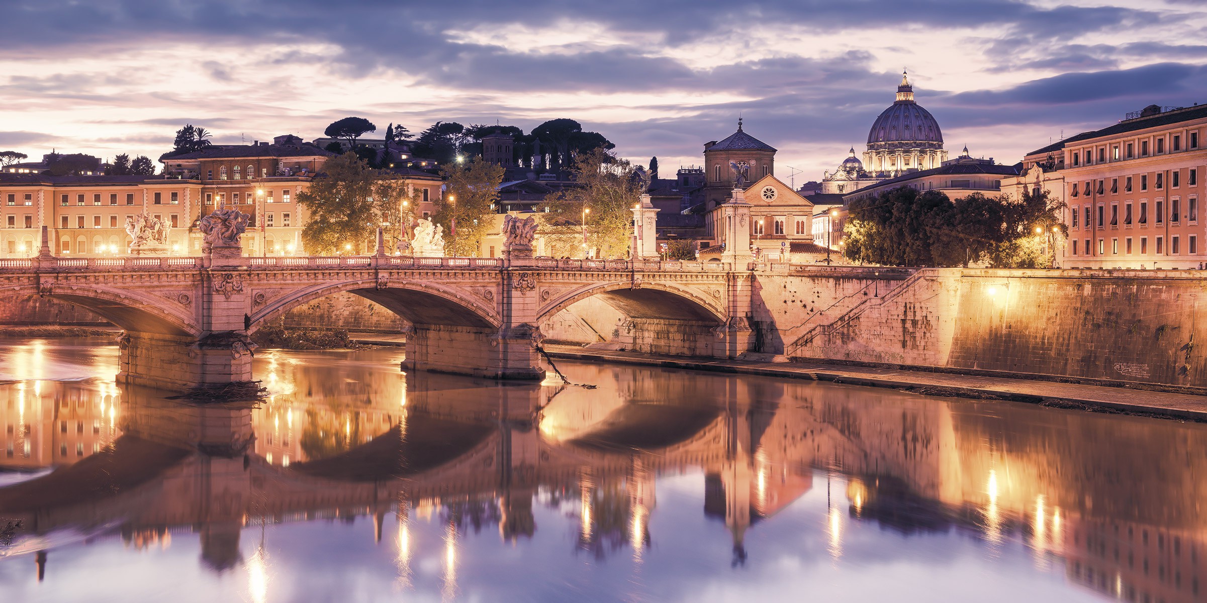Ночной Рим – в спокойных водах Тибра отражаются очертания древнего города.