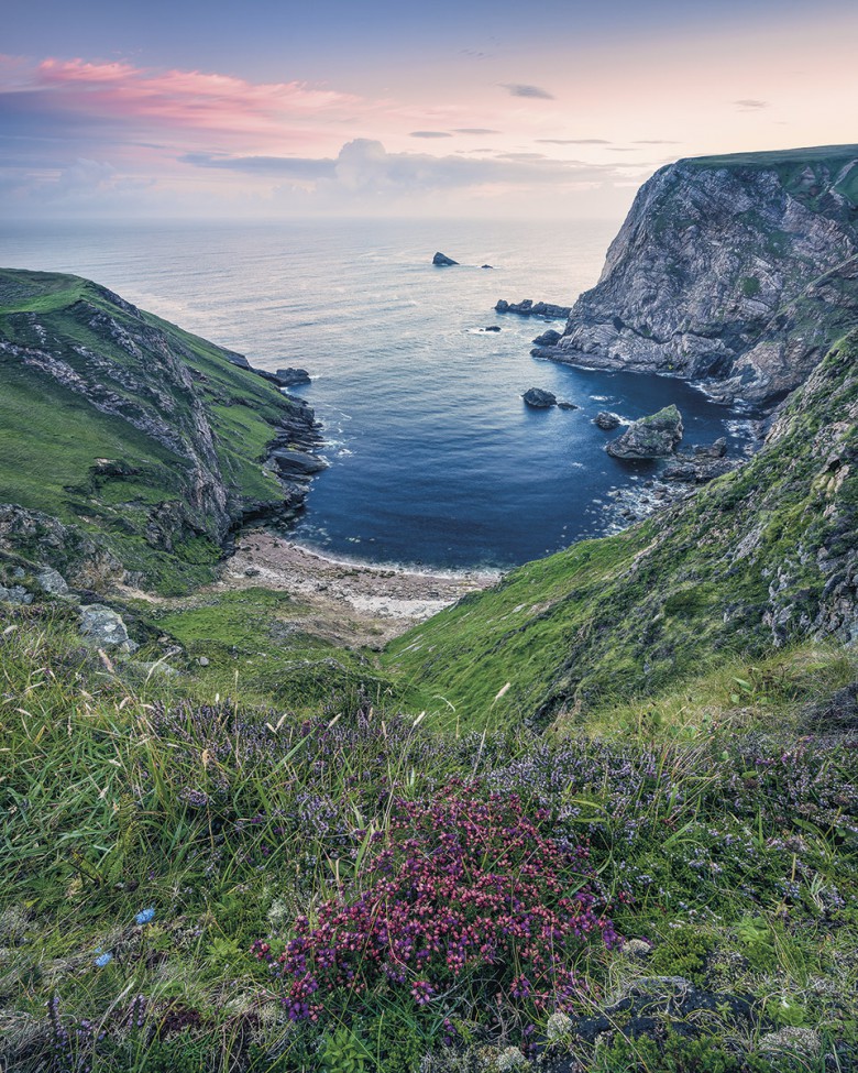 Знаменитая бухта Blue Bay в Ирландии: темно-синяя вода образует яркий цветовой контраст с обрамляющими ее зелеными холмами.