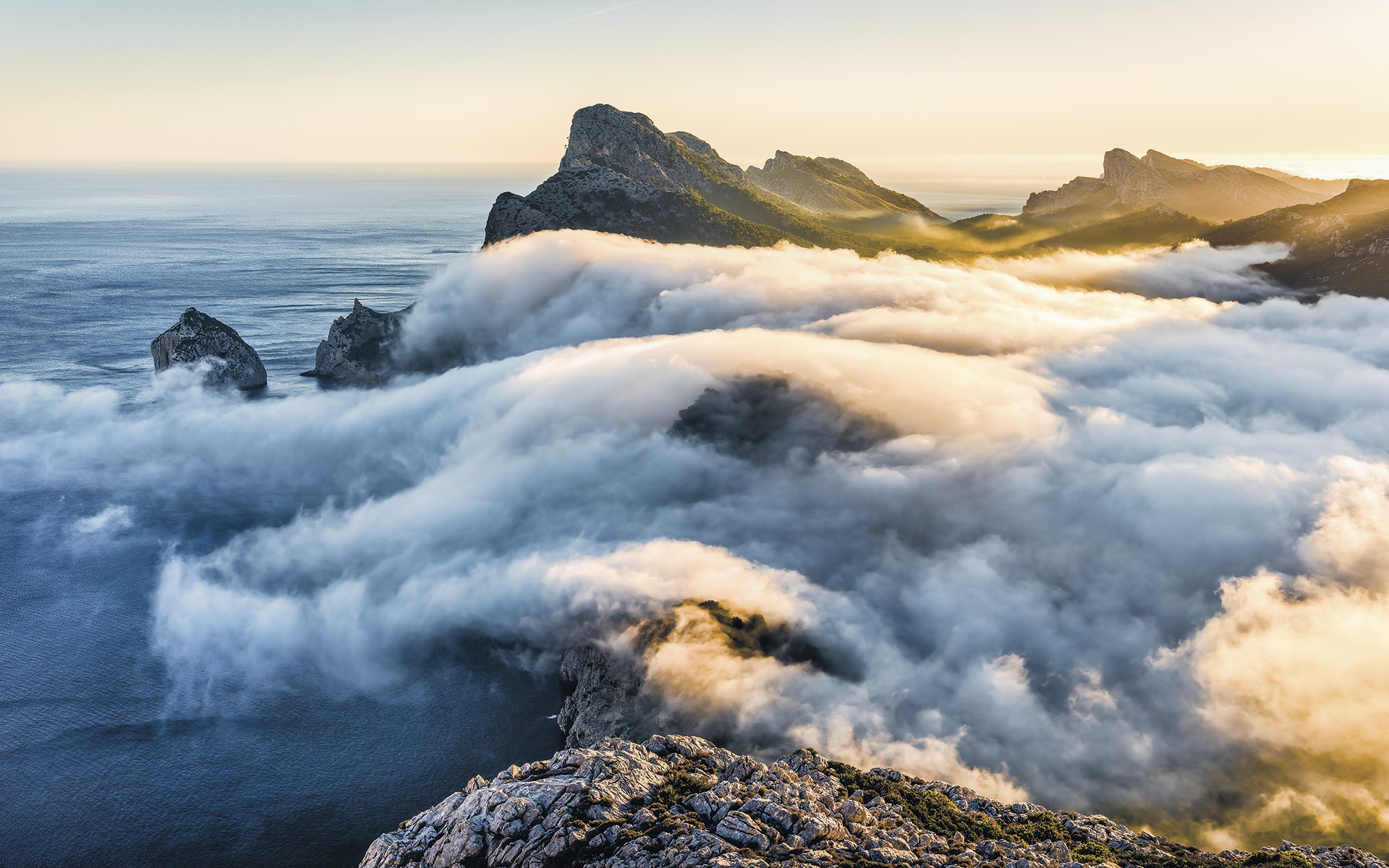 В ранний утренний час скалистый берег Майорки все еще укрыт туманом.