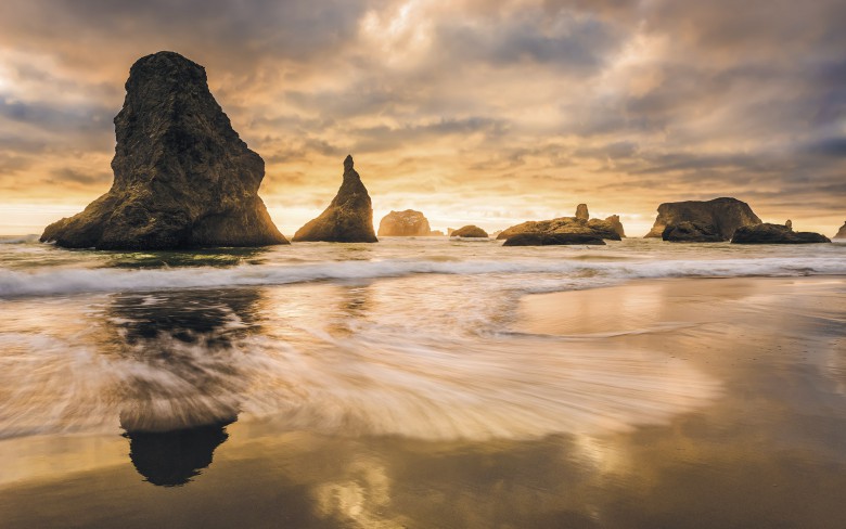 У берегов американского штата Орегон волны плещутся в неизменном ритме приливов и отливов, отражая мягкий золотистый свет заходящего солнца.