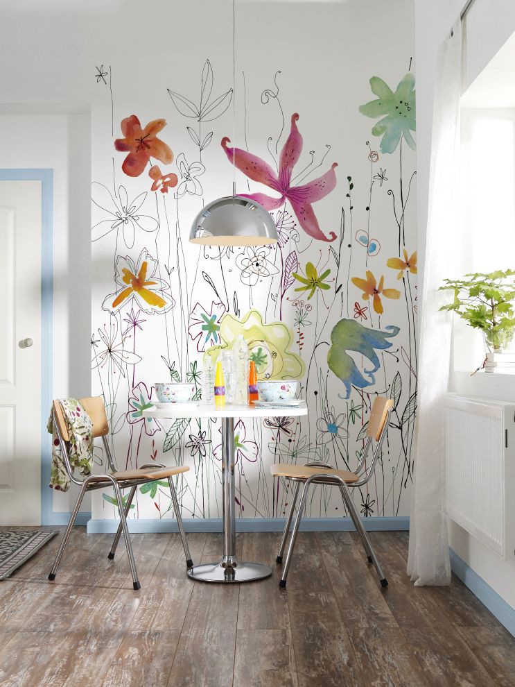 Мыльные пузыри и цветочные пятна создают яркие акценты.
