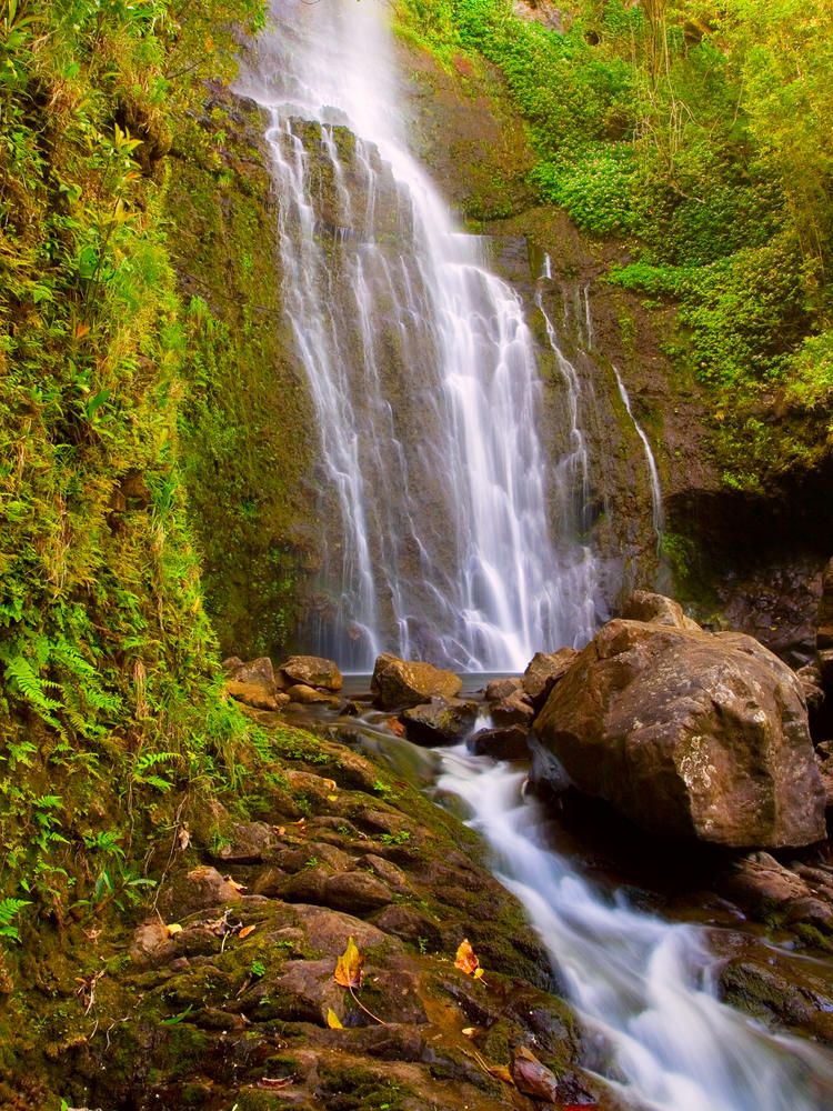 Водопад в зеленом лесу на камнях