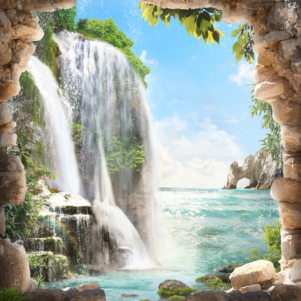 Каменная арка с видом на водопад и море